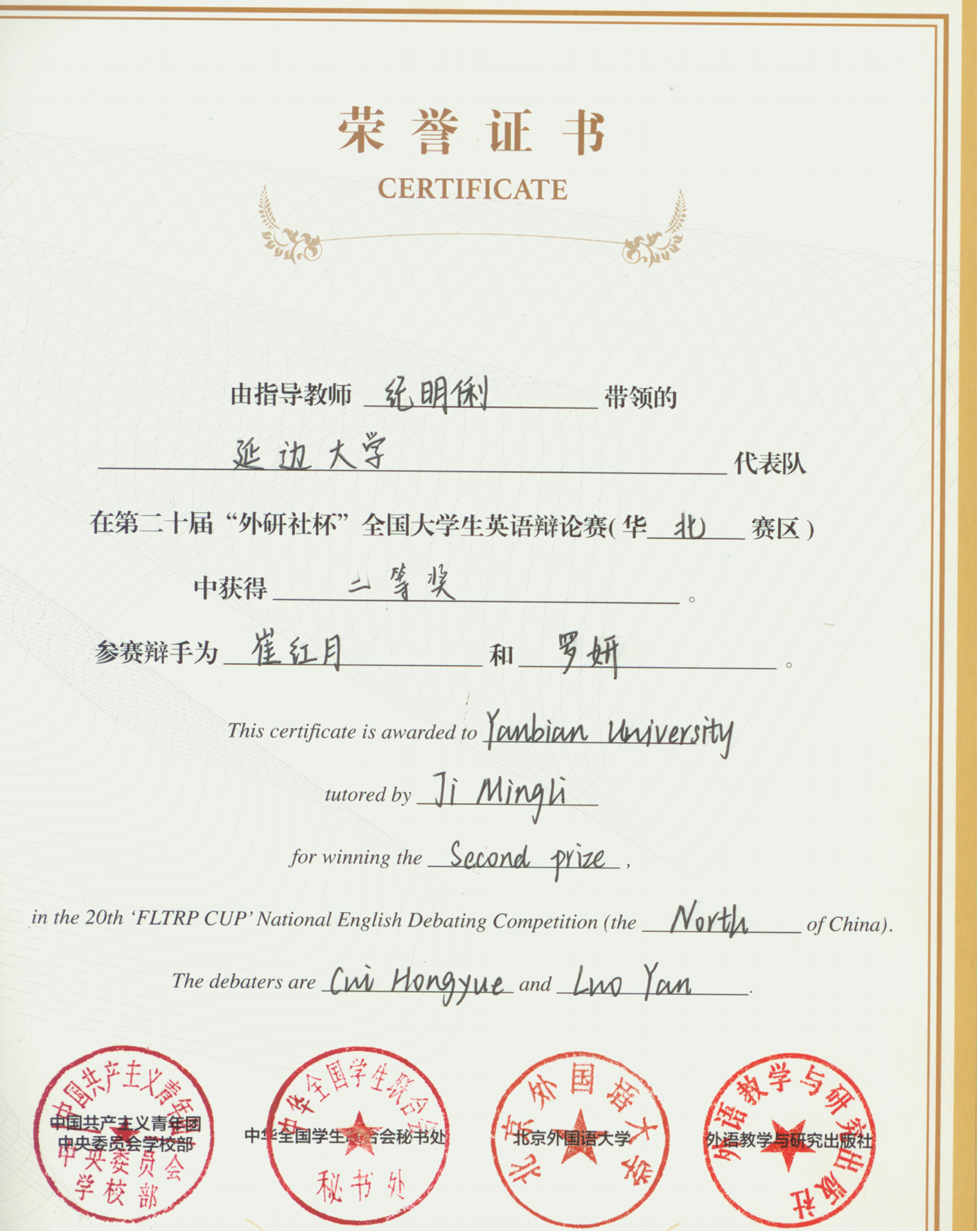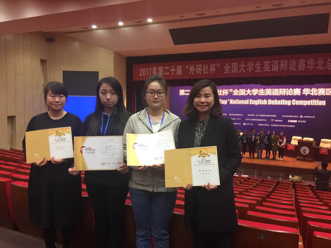 2017年4月2日至4日,由共青团中央、全国学联、北京外国语大学主办,外研社承办的“第二十届‘外研社杯’全国大学生英语辩论赛华北赛区总决赛”在中央财经大学举行。来自北京、天津、河北、黑龙江、吉林和辽宁等省市的97所高校代表队齐聚首都北京,为参加全国总决赛进行激烈比拼。44118太阳成城集团外国语学院2014级崔红月同学与工学院2015级罗妍同学,经过两天五场循环赛的激烈角逐,凭借缜密的思维与有力的陈述,最终获得华北赛区二等奖,并成功晋级到下一轮全国总决选。其他晋级的学校还有首都师范大学、中国人民大学、东北大学秦皇岛分校、北京语言大学、大连交通大学、沈阳师范大学、清华大学、北京外国语大学、辽宁大学、中国石油大学(北京)、外交学院、北京航空航天大学、北京工业大学、大连理工大学、中国政法大学、中央财经大学、北京大学、北京第二外国语学院、东北大学、中央民族大学、东北财经大学、中国农业大学、河北工业大学、天津外国语大学、装甲兵工程学院和哈尔滨师范大学。