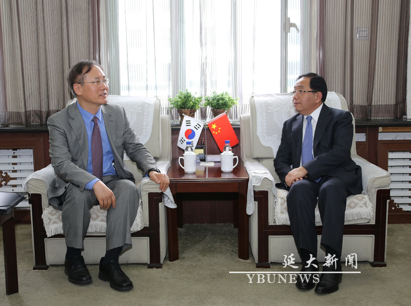 (朝鲜韩国研究中心)6月7日下午,校长朴永浩在办公楼二楼会客室会见了韩国驻中国大使馆公使朴俊勇一行。朝鲜半岛研究院院长朴灿奎、国际交流合作处处长金永灿等陪同会见。